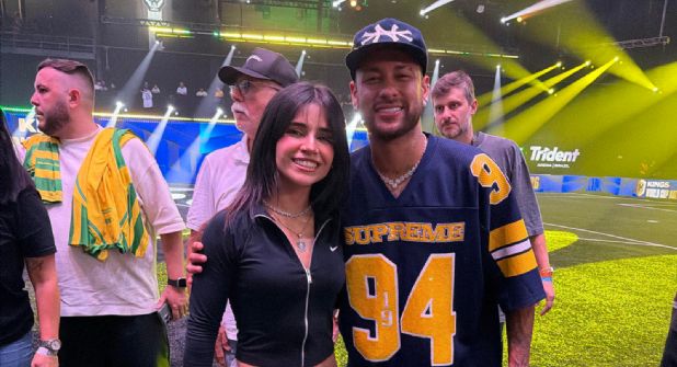 En la imagen se observa a Alana Flores posando junto a Neymar, actual presidente de la selección de Brasil dentro del formato de la Kings World Cup Nations, lo que simboliza la conexión entre el mundo del streaming y las grandes figuras del fútbol profesional.