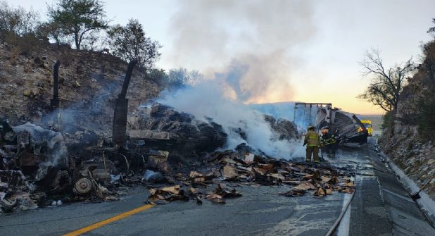 Tras el choque, ambas unidades se incendiaron, lo que agravó la situación y bloqueó por completo la vialidad en ambos sentidos.