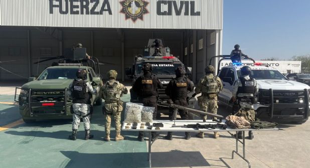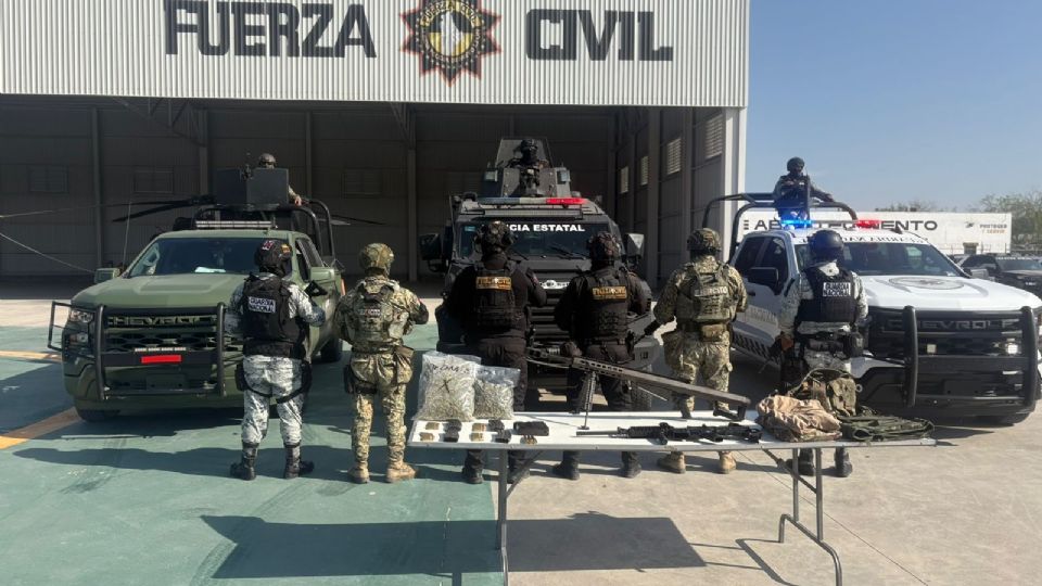 Un operativo entre corporaciones estatales y federales derivó en el aseguramiento de armas largas, droga y equipo táctico en el municipio de Cadereyta, Nuevo León.
