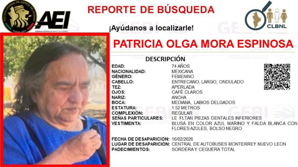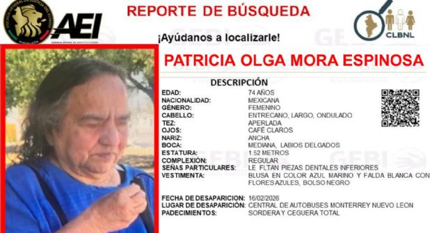 La angustia se apodera de la familia de Patricia Olga Mora Espinosa, una mujer de 74 años que se encuentra desaparecida desde que fue vista por última vez en la Central de Autobuses de Monterrey.