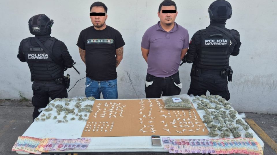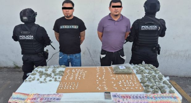 Elementos de la Policía de Monterrey detuvieron a Jorge Dionicio "N", de 32 años, y Gustavo Adolfo "N", de 24 años, en el cruce de Juan Méndez y Tapia, en pleno centro de la ciudad, luego de encontrarles 211 dosis de diversas sustancias ilegales.