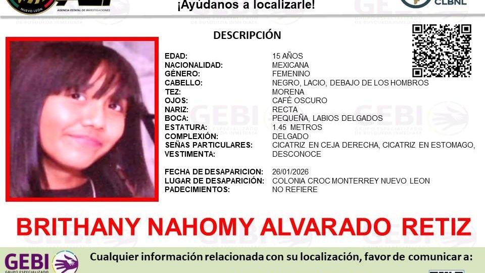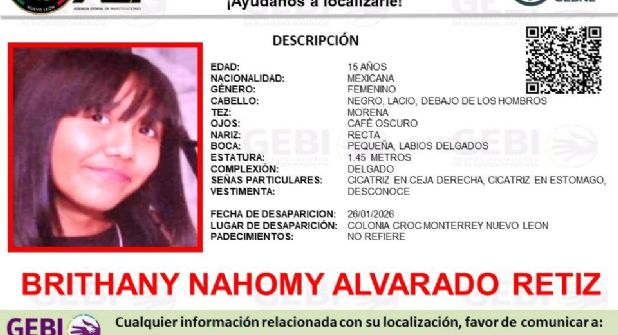 Una menor de 15 años fue reportada como desaparecida luego de salir de su domicilio en la colonia Croc, en Monterrey, durante la noche del pasado 26 de enero, situación que llevó a sus familiares a solicitar apoyo urgente a la Fiscalía de Nuevo León.