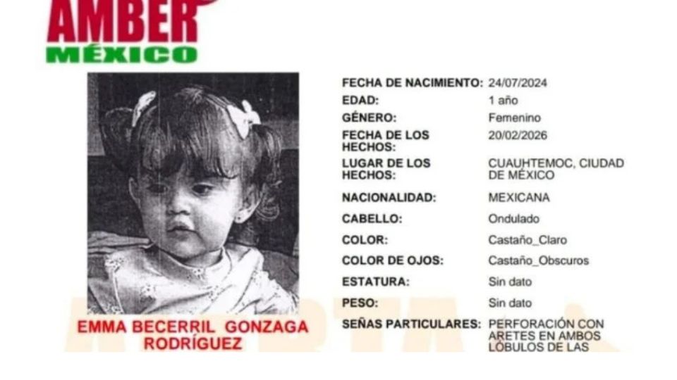 La Fiscalía General de Justicia de Nuevo León activó una Alerta Amber en coordinación con las autoridades de la Ciudad de México para localizar a Emma Becerril Gonzaga Rodríguez, una menor de un año de edad que desapareció en medio de un conflicto legal por su custodia.