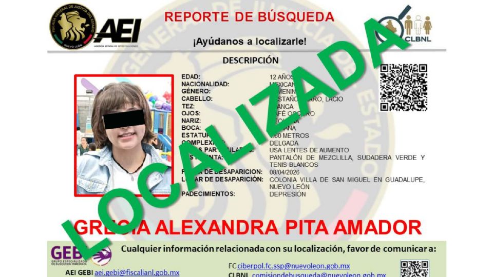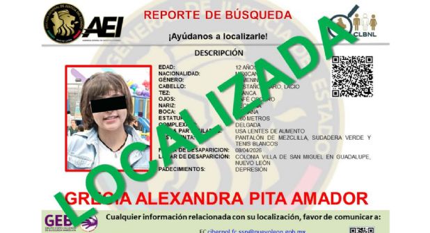 La menor Grecia Alexandra, quien contaba con reporte de búsqueda en Nuevo León, fue localizada con vida, informó la Fiscalía General de Justicia de Nuevo León a través de la Agencia Estatal de Investigaciones (AEI), lo que generó alivio entre la comunidad que participó activamente en la difusión del caso.