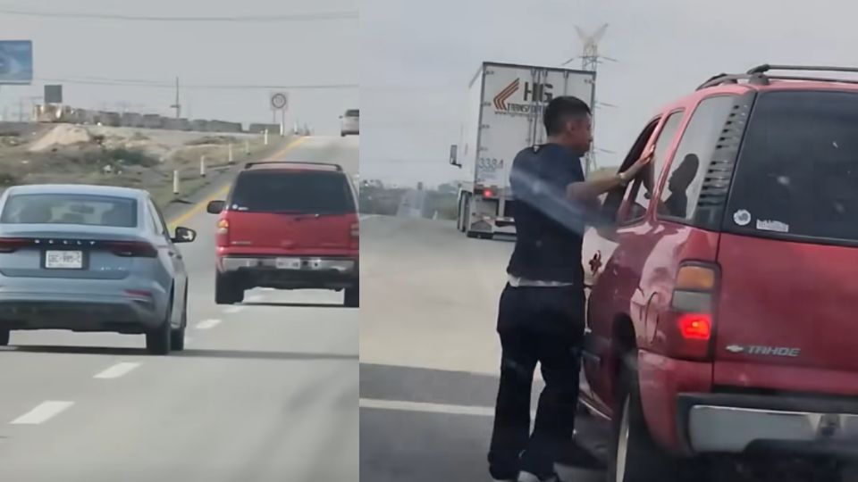 Posteriormente, el vehículo se detiene en el acotamiento y el conductor del Geely baja y se acerca a la ventanilla del conductor de la camioneta, exigiéndole sus pertenencias, sin que se le vea portar un arma.
