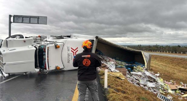 De acuerdo con el reporte oficial, se trató de un tractocamión Kenworth color blanco, el cual transportaba una carga de jugos y electrolitos. Por causas que aún se investigan, la unidad volcó sobre la carpeta asfáltica.