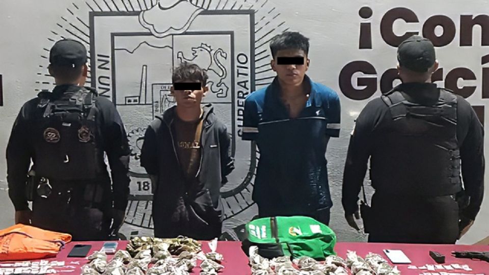 Uno de los detenidos fue identificado como Pedro Damián “N”, de 20 años, quien portaba un arma corta y narcóticos. El segundo implicado es un menor de 17 años, identificado como Evin Axiel “N”, quien también llevaba un arma de fuego, múltiples dosis de droga y equipo para su posible distribución.