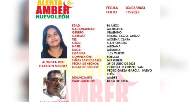 La Fiscalía General de Justicia de Nuevo León lanzó una Alerta Amber por desaparición de Alondra Rubí Carreón Méndez, de 14 años de edad, quien fue vista por última vez el pasado 29 de julio en la colonia El Obispo en el municipio de San Pedro Garza García.