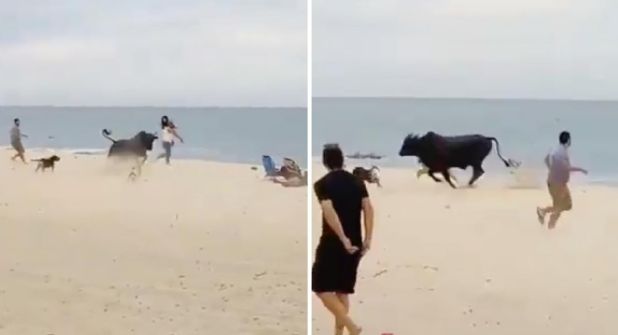 El momento más tenso se vive cuando una mujer, al parecer extranjera, trata de levantarse lentamente de la arena, junto con sus pertenencias, pero el toro no la pierde de vista.