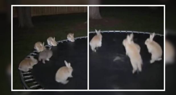 El corto de apenas ocho segundos de duración muestra a un grupo de conejos en la orilla de un trampolín. Tres deciden brincar en medio y entonces sus compañeros los siguen en una coreografía insólita. Un sinfín de personas creyeron en la veracidad de las imágenes, las cuales parecen grabadas a través de una cámara de seguridad cualquiera. La escena acumuló una gran cantidad de vistas, pero en poco tiempo también se desmintió.