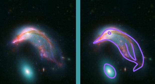 La Administración Nacional de Aeronáutica y el Espacio (NASA por sus siglas en inglés) logró captar con los telescopios Hubble y Spitzer una imagen de dos galaxias que parecen formar un pingüino cósmico y su huevo, las cuales le dieron la vuelta al mundo.