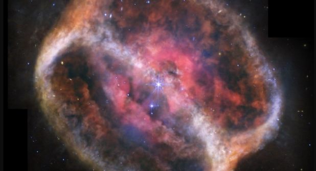 En el corazón de esta nebulosa se encuentran dos estrellas en estrecha órbita, que aparecen como una sola en la imagen del Webb. Una de ellas, mucho más masiva que el Sol, expulsó sus capas externas, dejando tras de sí una estrella enana blanca. Esta interacción estelar, que lleva desarrollándose por al menos 4.000 años, ha dado forma a un entorno turbulento de gas y polvo en constante transformación.