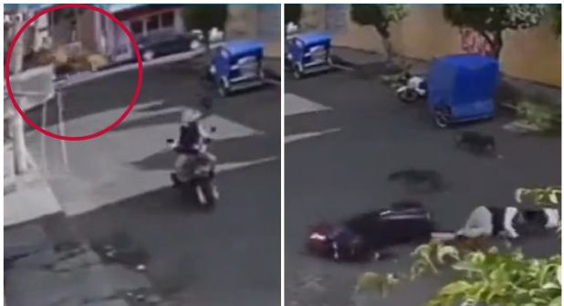 ¡Perro taclea a motociclista desde el techo!