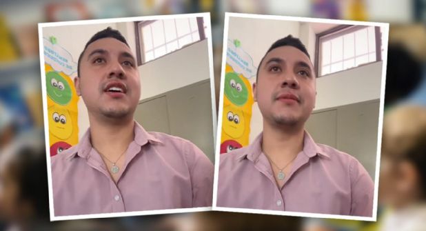 El joven docente da clases a pequeños estudiantes de primer grado de primaria, pero a decir por el audio que se logra escuchar, los tiene bien instruidos al momento de restablecer el orden en el aula escolar.