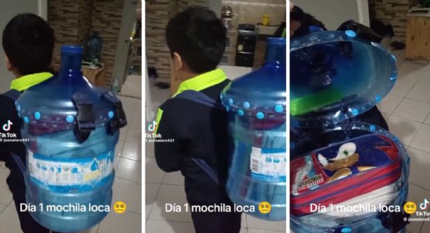 En las imágenes se aprecia a un niño con un garrafón en la espalda, pero su madre supo como adaptarlo para que él pudiera colocar dentro todos sus útiles, libros y libretas.