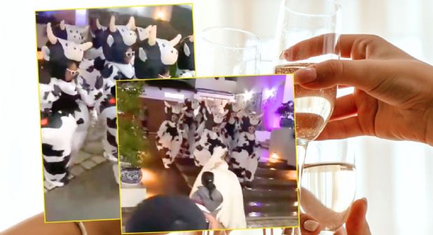 Aún no queda del todo claro qué significado tiene las vacas para la novia, o si fue un consenso en portar algo divertido en uno de los días más importantes para la novia.