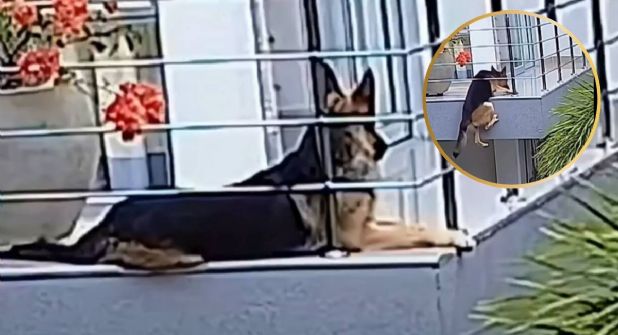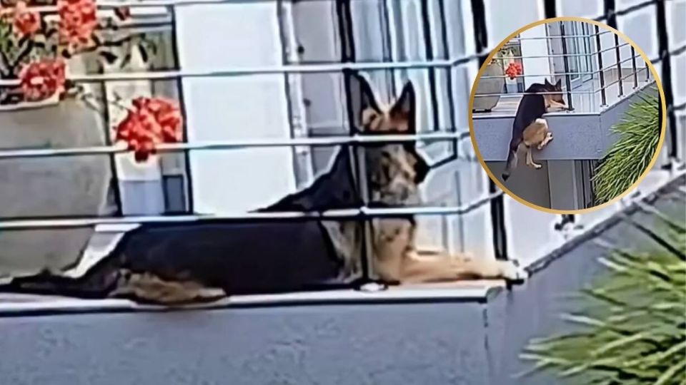 En el video se puede observar que el perrito estaba acostado a la orilla del balcón, sin embargo, la estructura metálica, que contaba con espacios demasiado amplios, no fue suficiente para contener el peso del pastor alemán, quien terminó deslizándose. Durante casi un minuto, él estuvo sostenido únicamente por sus patas delanteras.