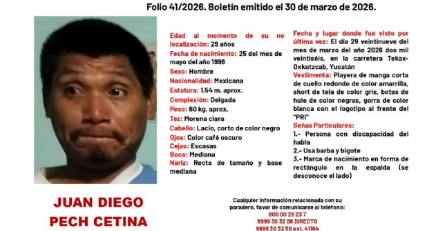 La Secretaría de Seguridad Pública (SSP), en coordinación con autoridades municipales y familiares, mantiene un intenso operativo para localizar a Juan Diego Pech Cetina, de 28 años, reportado como extraviado en el municipio de Oxkutzcab. Desde el primer reporte, las fuerzas de seguridad han desplegado brigadas de búsqueda en la zona sur del estado para dar con su paradero.